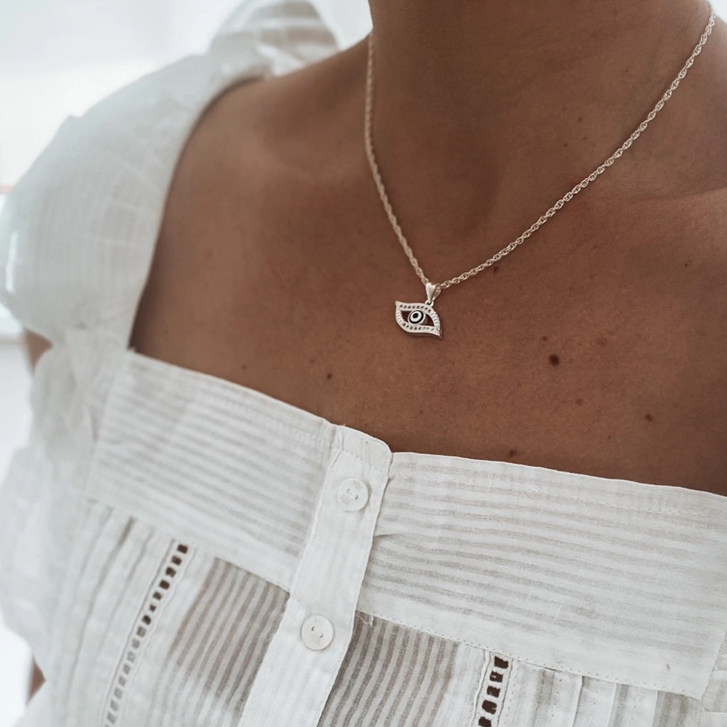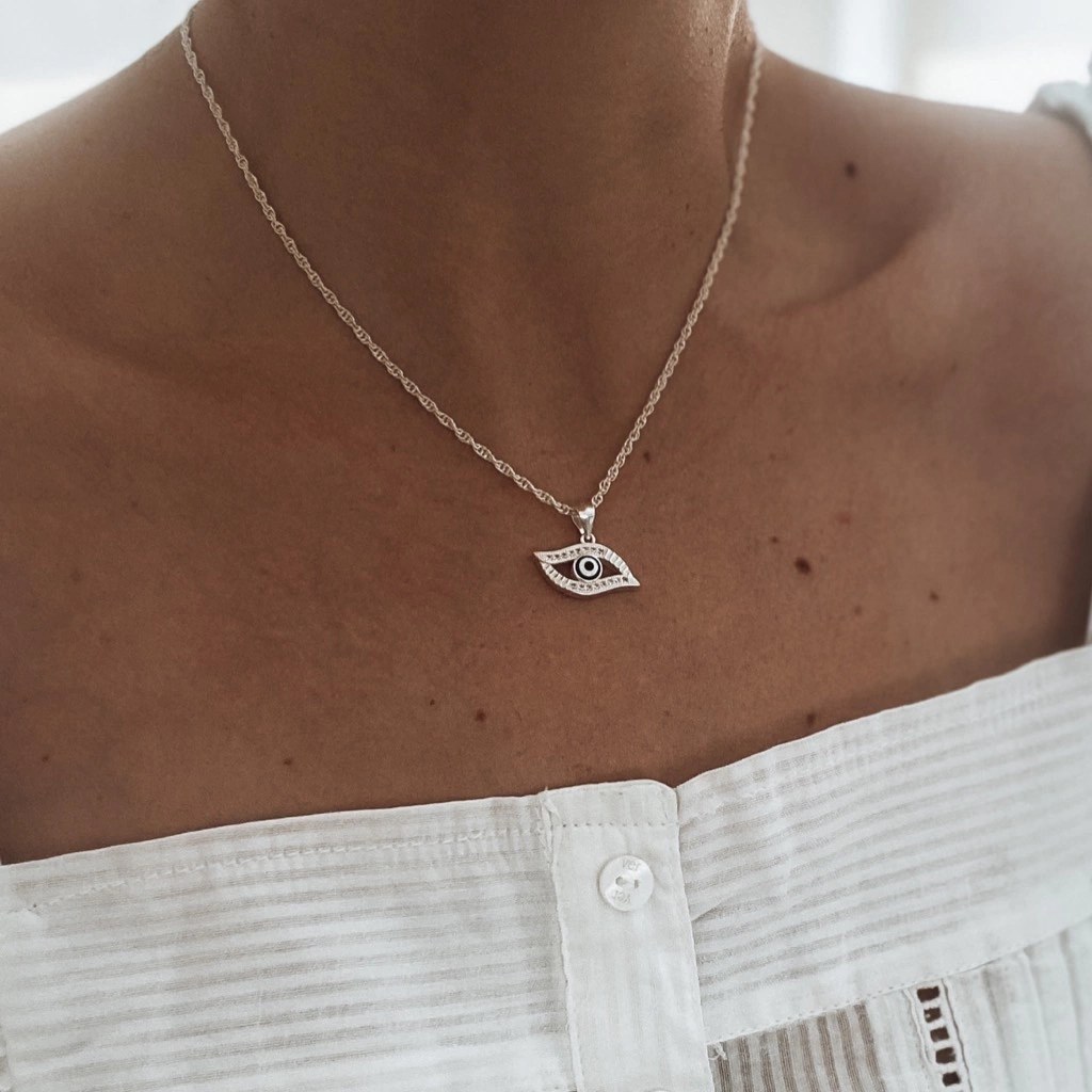 - Esta cadena es de plata lisa, con dije en cubics "Ojo de Turco" inluido. Su medida es de 45cm.